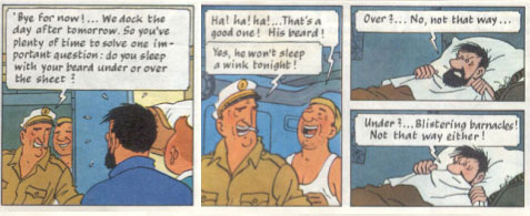 In fact, Captain Haddock steals the show in this book, full stop. He is ‘onscreen’, as it were, for as much time as Tintin, and he makes us laugh all the way through. He is the subject of a wonderful Medusa joke on page 39 when he falls into the sea – for the second time – and emerges with an octopus on his head. (The characters are on a raft at this point, of course, and whenever you get a raft, you invariably get a reference to Géricault’s marvellous painting, The Raft of the Medusa.) When Captain Haddock spots Bianca Castafiore aboard the yacht that rescues the castaways, his reaction is to ask whether or not they should ‘hop back on the raft’. On the frigate, he yells obscenities at the slave trader through a megaphone until this ‘trafficker in human flesh’ is well out of earshot. And an especial bonus: the frigate is captained by the Best Bad Guy in Tintin, Captain Haddock’s old first mate Allan.