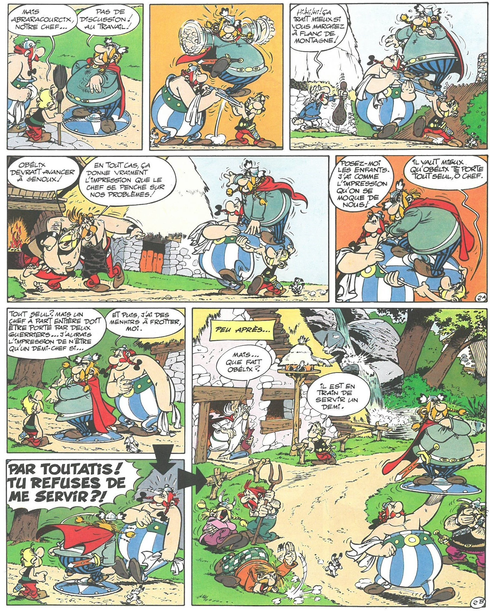 Development: Asterix doesn’t develop in the way that Tintin does. Tintin doesn’t have any kind of background or a personal history outside of the oeuvre, but he gradually collects a ‘family’ around him and sets up home with Captain Haddock and Professor Calculus at Marlinspike. When we first meet Tintin, he is a reporter, or journalist, living and working alone. By the end of the last Tintin book, he is in a very different position. Asterix, on the other hand, doesn’t develop and doesn’t need to: he just is. Uderzo’s forays into Asterix’s childhood with Obelix produced some rather unsuccessful books aimed at a much younger readership. If it ain’t broke, don’t fix it, and Uderzo would have done better to stick with the winning formula: the village is threatened, Asterix and Obelix beat up lots of Romans, the story ends with an enormous banquet and the bard gagged and bound beneath the tree so he can’t ruin everyone’s evening by singing.