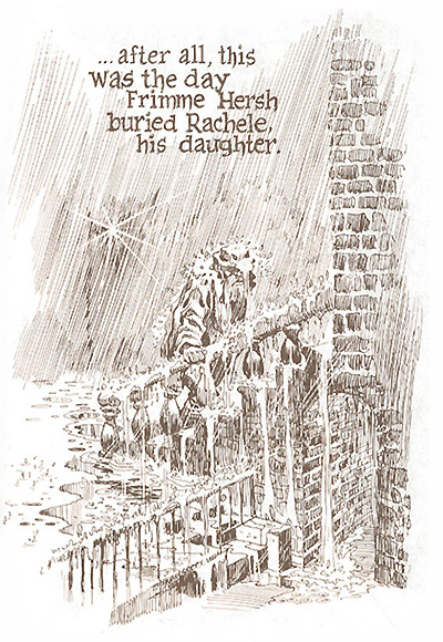The torrential downpour mirrors and magnifies the tears of Frimme Hershe, who is returning from burying his daughter, Rachele, the fictional counterpart of Eisner’s own daughter, Alice, who died of leukaemia when she was a teenager. Overwhelmed by grief, Hershe breaks his contract with God and becomes a ruthless landlord, but he never loses our sympathy because we have seen what he once was and we know what shape his demons take.